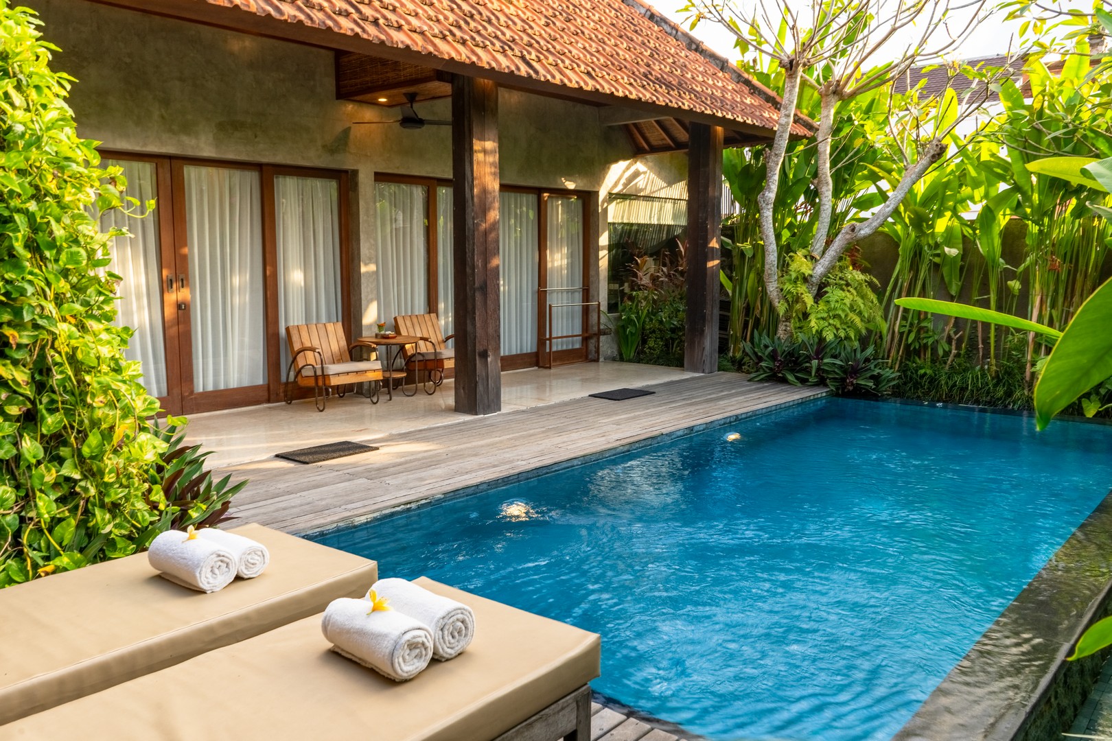 Two-bedroom pool villa with private terrace overlooking lush gardens and private infinity pool, complete with a wooden sun deck and dining pavilion with kitchenette.
